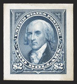 produced 1987 PF certificate.#293P2a, $2.00 Trans-Mississippi, "Panama-Pacific" small die proof on yellowish wove, full large margins, rich color, without the usual toning, very fine; no more than five were produced; 1987 PF certificate. (Image) $1,250.00