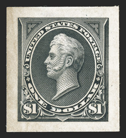 paper, extremely fine a very rare trial color proof, particularly in t#261ATC1, $1.00 Lake, large die proof on card, 145x193mm with full die sinkage, marvelously fresh, with deep luxuriant color and a superbly detailed impression on bright card paper, extremely fine; a very rare trial color proof, particularly in this large size gem condition; ex-Wunderlich. (Image) $1,500.00