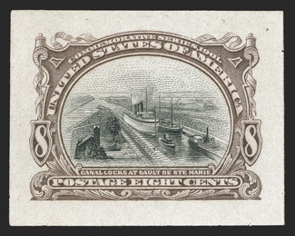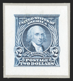 produced.#312P2a, $2.00 Blue, "Panama-Pacific" small die proof on yellowish wove, large full margins with a couple small edge dings at right, strong color, very fine; only 3-5 examples were produced. (Image) $2,500.00