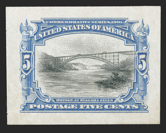 incredibly rare and possible unique Scott does not list any trial#297TC, 5c Dark blue and black, trial color proof on proof paper, in a dark blue shade quite distinct from the issued color, large balanced margins, crisp impressions, very fine; incredibly rare and possible unique; Scott does not list any trial color proofs for the Five Cent Pan-American; 1986 PF certificate. (Image) Est. $1,000-1,500