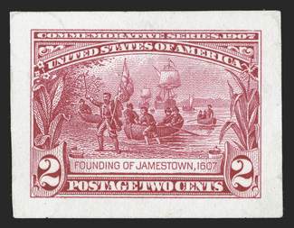 dots at top, 2c with just a faint trace of a translucent spot, very fine#328P2-330P2, 1c-5c Jamestown, small die proofs on wove paper cplt., each with large balance margins, beautiful colors on pristine white paper, 1c with a couple red printing dots at top, 2c with just a faint trace of a translucent spot, very fine; overall a handsome set of these rarely offered proofs. (imagea) (imageb) (Image) $2,700.00