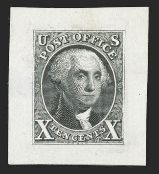 size trial color proof ex-Chesapeake.#2TC1, 10c Washington, large die trial color proof in Light brown on India, 53x64mm die sunk with cross-hatching, lovely fresh color, extremely fine and choice; a beautiful full size trial color proof; ex-"Chesapeake". (Image) $1,000.00