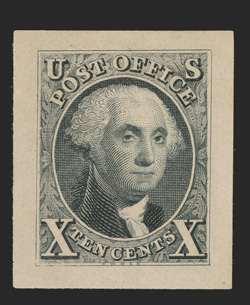 fine.#2TC1, 10c Washington, large die trial color proof in Dark green on India, 51x64mm die sunk with cross-hatching, bright color, shallow thin at top, otherwise extremely fine. (Image) $1,000.00