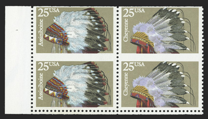 of six, o.g., n.h., fine-very fine according to Datz and Scott this#2505d, 25c Indian Headdresses, booklet pane of ten, horizontally imperforate in the middle, the booklet pane had been split at the fold and is now a block of four and a block of six, o.g., n.h., fine-very fine; according to Datz and Scott this is the only recorded example of the imperforate between variety, making it one of the key rarities of the modern imperforate errors; each block accompanied by a 1992 PF certificate; listed but unpriced in Scott and Datz. (imagea) (Image) Est. $2,000-3,000