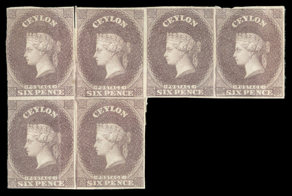 of six (strip of three - one with tear at top, vertical pair and a sing6d. purple-brown on unwatermarked paper, a block of eight [173-176/185-188] with clear to good margins, each vertical row severed and rejoined, and a rejoined irregular block of six (strip of three - one with tear at top, vertical pair and a single); two distinctive shades both with creases and/or wrinkles. (imagea) (Image) Est. $400-500