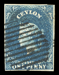 lovely deep color) and 1857-59 1d. blue (3), all cancelled by oval1857 (15 Oct.) envelope to Dublin, marked "Overland Route via Marseilles", bearing 6d. purple-brown (small to large margins showing portion of adjoining stamp at right and of lovely deep color) and 1857-59 1d. blue (3), all cancelled by oval of bars, showing red London Paid transit datestamp (14.11) alongside and, on reverse, "colombo/steamer letter" datestamp; the envelope pressed and with some repaired tears, and the stamps almost certainly lifted and replaced. R.P.S. Certificate (1974). Sc. 2, 3a; S.G. 1, 2a. (Image) Est. $1,500-2,000