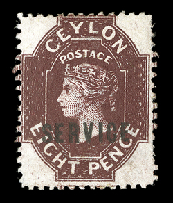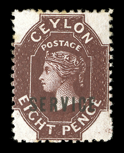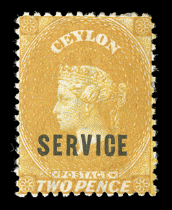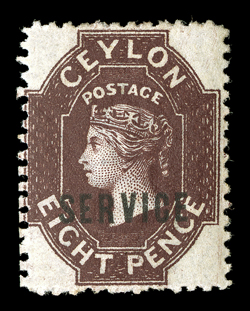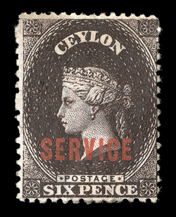 2173 O   A collection of imperforate and perforated values mounted and written-up on thirty-three pages with enlarged photographs of the stamps showing re-entries in manuscript; comprising 1d. (106) with a plate proof pair in black, several contained in multiples including a block of four and five on covers, four at the inland rate and one with 2d. and 9d. to England; 2d. (38) with imperforate pairs (2) and a strip of five and 1863-66 strip of three on piece; 6d. (19) with three imperforate; 8d. (4) with one imperforate (toned); 10d. (8) with one imperforate, and 2/- (6); condition quite mixed as to be expected with a collection of this nature and which is accompanied by a wonderful c.1650 Robert Morden map of Ceylon and the Maldives, used as a frontispiece. A most interesting lot with viewing essential. Est. $2,000-3,000