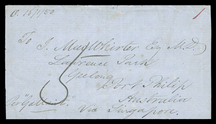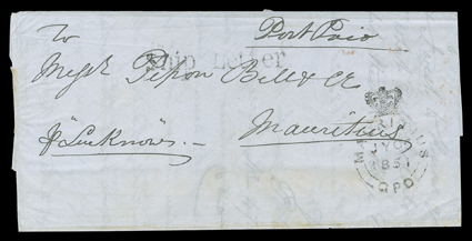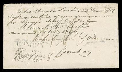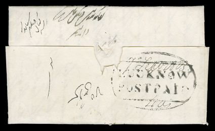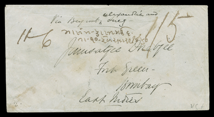 3234 c   British India pre-stamp and post-stamp unfranked covers, a substantial holding of over 310 stampless folded letters or covers, majority to the United Kingdom, but there are also many other foreign destinations represented, and many are domestic usages including native covers, there are various handstamps including Post Paid and Great Britain ship letter markings, good range of origins, some faults, most fine-very fine. (imagea) (imageb) (imagec) (imaged) (imagee) (imagef) (imageg) (imageh) (imagei) (imagej) (imagek) (imagel) (imagem) (imagen) (imageo) (imagep) Est. $2,000-3,000