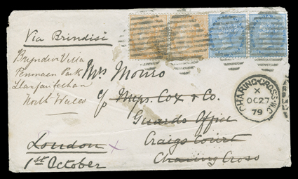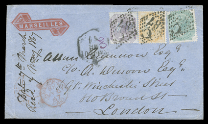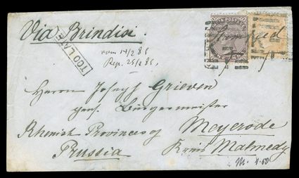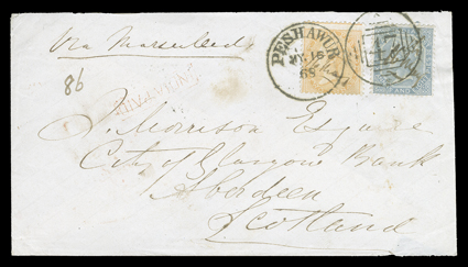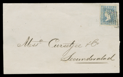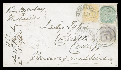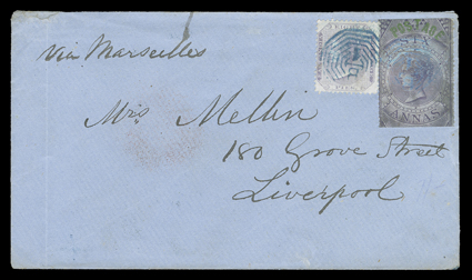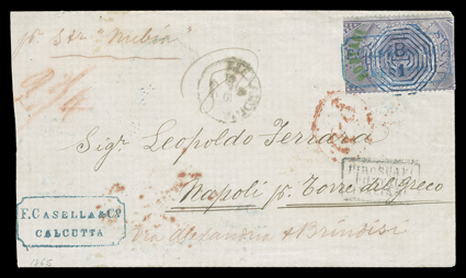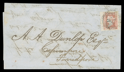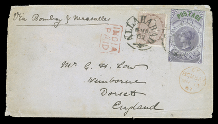 3235 c   East India Company and Crown Colony issues huge 19th century cover holding of over 1,150 covers and cards showing various rates and frankings with Queen Victoria issues, with domestic usages including small towns, scarce postmarks and many native covers, foreign destinations, mostly the United Kingdom, but also others, with many two to four color frankings, also better frankings including usages of the fiscal stamps, some stationery, etc., typical mixed condition including some fronts or partial covers, many fine-very fine; a great holding to break down for internet sales. (imagea) (imageb) (imagec) (imaged) (imagee) (imagef) (imageg) (imagei) (imagej) (imagek) (imagel) (imagem) (imagen) (imageo) (imagep) Est. $10,000-15,000