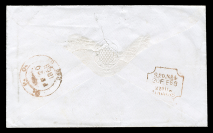 reverse of native cover to Calcutta, double circle Moulmein12 Fe, 1Barefoot Receipt #2, 1860 1a Lilac Receipt Bill or Draft on blued paper, horizontal strip of three and single, cancelled with octagonal B127 postmark of Moulmein, Burma, on reverse of native cover to Calcutta, double circle "Moulmein/12 Fe, 1861" datestamp on front and "Calcutta/G.P.O./Fe ?, 1861" arrival backstamp, stamps affected by a light horizontal crease, otherwise fine; a unique Revenue usage accepted to prepay postage; 2008 RPS certificate. (Image) Est. $1,000-1,500