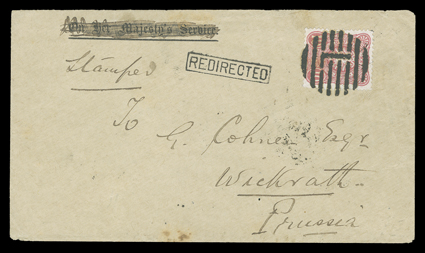 67 hexagonal transit backstamp and red SukkurAp 18, 67 arrS.G. #O3, 1866 "Service" overprint on 1a Brown, tied by "Dera Ghazee Khan" numeral "65" duplex postmark to official 1867 partially printed folded notice to Sukkur, red "Mooltan/Ap 16, 67" hexagonal transit backstamp and red "Sukkur/Ap 18, 67" arrival postmark, very fine and scarce usage entirely within the area now known as Pakistan. (Image) Est. $200-300