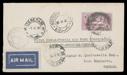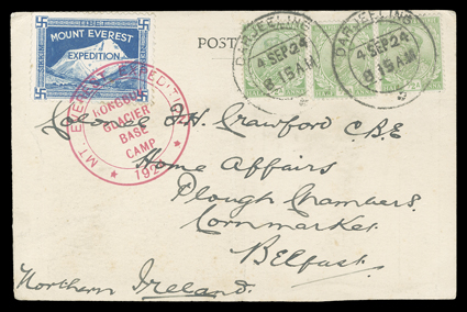 flight cachet to cover to England, matching violet wavy line Houston-MtHouston Mount Everest Expedition, flight over Kanchenjunga, cover franked by 1932 1a3p Mauve pair tied by violet triple circle "Houston Mount Everest Flight/Purnea/5.APR.33" flight cachet to cover to England, matching violet wavy line "Houston-Mt. Everest/Flight/1933" cachet on reverse, endorsed in manuscript at right "certified that this cover has been carried over Kanchenjunga 4/4/33" and signed "PFM Fellows", stamp with a bit of light toning, otherwise very fine; a great world air mail rarity, being one of only two covers carried; accompanied by considerable background material (Indian Air Mails catalog #33-20a).The Houston Mount Everest Expedition was mounted to fly over the summit of Mount Everest, two attempts having been sanctioned by the King of Nepal. The aeroplanes used were both Westlands, a PV-3 G-ACAZ and a Wallace PV-6 G-ACBR, each powered by a single Bristol Pegasus engine. The two flights over the summit by Squadron Leader the Marquess of Douglas and Clydesdale in the PV-3 and FLt. D.F. McIntyre in the PV-6 were both successful, the first on 3 April, 1933, and the second on 19 April, with 60 covers carried on the 3rd and eight on the 19th. On 4th April, 1933, Air Commadore P.F.M. Fellowes DSO, leader of the Expedition, decided to order another high altitude flight to test the survey cameras and other equipment. He and Flying Officer R.C.W. Ellison, each flying his own aircraft undertook a test flight over Kanchenjunga. They became separated near the summit of the mountain and, when Ellison in the PV-6 was about to resume station on the PV-3, Fellows began to turn left. Ellison had to turn away so steeply that he side-slipped for about 2,000 feet. Unable to rejoin his leader he returned alone. Fellows, having trouble with his oxygen mask and having to navigate for many miles over low clouds, laid a faulty course, realized he was lost and made an emergency landing at Dinajpur, some 60 miles east of Purnea, where, short of petrol, he spent the night. Each member of the expedition was allowed to place one envelope in the mailbag to be flown on the first attempt. (Image) Est. $1,000-1,500