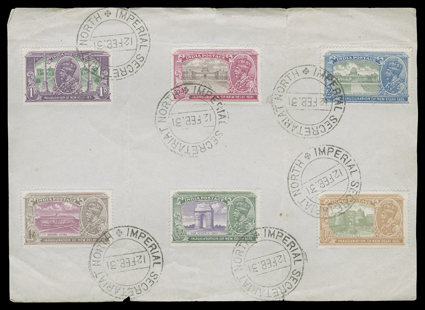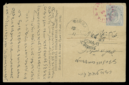 respectful complements of the Postmaster Abadan and in a differentS.G. #155/185, 1911 ½a/1R George V, nine different values tied to folio leaf by separate strikes of "Abadan/21 May.17" datestamps, dated the same day and with the notations "With respectful complements of the Postmaster Abadan" and in a different hand "A set of Indian Postage Stamps issued at this Oil Company's Works at Abadan, which is in Persia. The ordinary stamps in use is Persian, the Persian Government was rather annoyed at this private post office being started, as it did them out of a part of their own revenue." File folds not affecting the adhesives, very fine and unique. (Image) Est. $400-500
