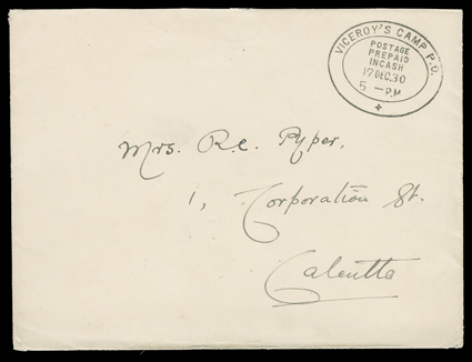 3237 cO   India covers, cards and postmarks collection, many hundreds of covers and cards and a couple hundred stamps from Queen Victoria to Independence largely written-up in seventeen cover albums, includes States postmark studies of Ajmere, Bikaneer, Bombay City, Indore, Jaupur, Nabha, Rajasthan, Sambhar Lake and Marwar District, railroads including Kuchaman Road Disbursing Office, good first flight and air mail covers, censored and army field post offices, postage dues, express, mint and used postal stationery, cancellations on stamps including used abroad, as well as some G.B. and miscellaneous, mixed condition, many fine-very fine; viewing is essential. Est. $1,500-2,000