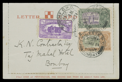 pocket fold over which a contemporary clipping from Gibbons Monthly JournaHiscocks #44, 1890 4a Blue Telegraph, tied to printed cover to the London & Westminster Bank in London by two strikes of 1905 Bombay c.d.s., backstamped, harmless vertical pocket fold over which a contemporary clipping from Gibbons Monthly Journal has been pasted, very fine and unusual; 2006 BPA certificate. (Image) Est. $200-300