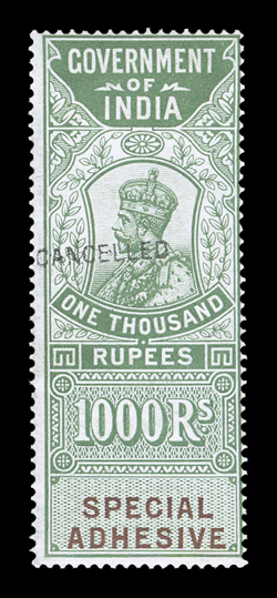 3173 S   George V revenue range overprinted "Cancelled," with a few to 1,000R for various offices, including singles handstamped "Cancelled" and strips of three or four with large framed or unframed "Cancelled" handstamp covering the strips, also a few Edward VII to 500R, some faults, most fine-very fine. (imagea) (imageb) (imagec) (imaged) (imagee) (imagef) Est. $400-500