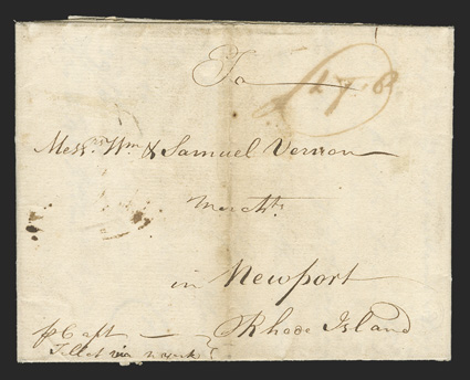 1 c   NEWYORK two-line handstamp on reverse of 1767 folded letter datelined London 27 Aug 1767 to Newport, R.I., with 13 FE in circle also on reverse, ms. 18 rate mark on front, the