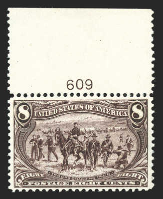 encountered both this large and so well centered 1990 PF certificate as a#289, 8c Trans-Mississippi, incredibly well centered within lavishly large margins for this value, deep luxuriant color and strong impression, o.g., extremely fine; seldom encountered both this large and so well centered; 1990 PF certificate as a plate no. single, the selvage having been subsequently removed. (Image) $175.00
