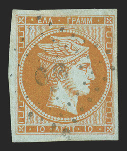 large margins, very fine an unlisted error that we could find no othe#7 var., 1861 10l Red orange on bluish, large figures on back, with additional small figures also on back, the small figures are lightly printed but full and quite clear, four large margins, very fine; an unlisted error that we could find no other example (Hellas #4 var.). (imagea) (Image) Est. $750-1,000