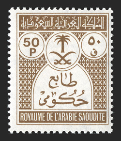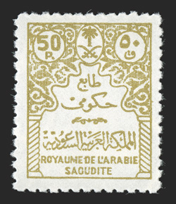 Saudi Arabia, not to mention one of the most elusive airmail stamps#C34, 1965 2p Green and dull purple, exceptionally well centered, bright fresh colors, pristine o.g., n.h., extremely fine; a choice example of one of the key modern rarities of Saudi Arabia, not to mention one of the most elusive airmail stamps of the world. (Image) $3,850.00
