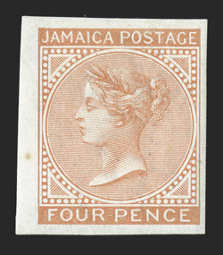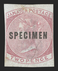 6s var.).S.G. #6s var., 1860 1/- Yellow-brown, double impression, overprinted "SPECIMEN" (Samuel Ty. D2), s.e at left, full o.g., fine; believed to be one of only two examples extant (Scott #6s var.). (Image) Est. $500-750