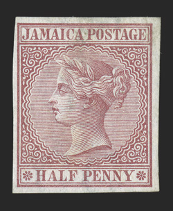 very lightly hinged, extremely fine and choice (Scott 5s).S.G. #5s, 1960 6d Dull lilac, imperforate, overprinted "SPECIMEN" (Samuel Ty. D2), right sheet-margin single, with generous margins on the other three sides, full clean o.g., very lightly hinged, extremely fine and choice (Scott #5s). (Image) Est. $100-150