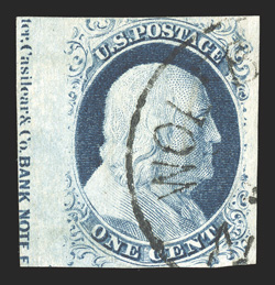 sheet margins at top and at left, while the other two margins#7, 1c Blue, Ty. II, position 1L2, the "misplaced transfer" position, displaying numerous surface cracks in top left and left sheet margins, a lovely gem example, with huge partial sheet margins at top and at left, while the other two margins are quite large, excellent detailed impression and strong rich color, nicely complemented by a light strike of a blue grid cancel, extremely fine; ex-Cowitt. (Image) 167.00