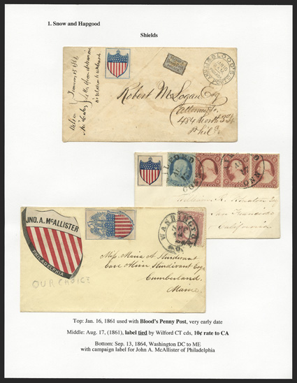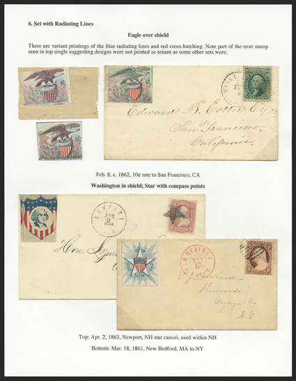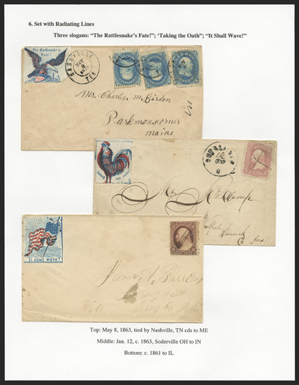 This collection was formed by the foremost student on Civil War labels, Dr. Arthur Groten. Dr. Groten has published several articles on the subject, the latest being found in the March-April 2011 edition of The Collector's Club Philatelist. Most of the labels are known in quantities of less than ten, and a good number in the collection are in fact unique. Anyone who has tried to find just one of these labels on cover knows what a challenge it really is. It would literally take decades, if not a lifetime, to search through dealer's stocks and auction houses big and small to replicate this impressive collection.