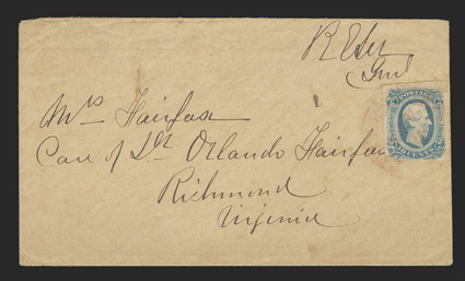 the model of the perfect soldier, he was offered the highest field comLee, Robert E. American general (1807-70); his remarkable success leading Confederate troops in the US Civil War made him a legend in his own day; known even before the war as the model of the perfect soldier, he was offered the highest field command by both sides at the start of hostilities. Outstanding war-date Autograph Letter Signed "R.E. Lee," 1/2 page, 4to, on blue paper, Petersburg, November 8, 1864. He writes Mrs. Mary R. Fairfax in Richmond in response to her letter on a promotion for her son, "I...am very sorry for the unpleasant situation of my young friend Ethelbert. I hope something may be done to relieve him. I have written to ascertain what action was taken on his recommendation for promotion in the Signal Corps. That seems to offer the speediest plan of amelioration, & at present I see no other. Please present my kind regard to the Dr. & your daughters." Folds, toning, small pieces of silk on verso to reinforce folds, sharp and VG. The Fairfaxes' son Randolph had been killed at Fredericksburg in December 1862, and on that occasion, General Lee had written a moving letter of condolence. Lee had always taken great care to avoid interfering in the careers of even his closest friends, on the principle that merit alone should dictate military promotions - something that gave the Confederacy an early advantage against Union armies studded with incompetent political appointments. Here we see that principle in action, as Lee promises only to see what action was taken, avoiding any suggestion that he will intervene on Ethelbert Fairfax's behalf. Fairfax had begun in the heavy artillery before being transferred to the Signal Corps. Though it was not a combat assignment, serving in the Signal Corps was extremely dangerous, as much of its work was done close to enemy forces, and sometimes even behind their lines. Disrupting enemy communications was a high priority for both sides. Indeed, despite his mother's pleas, Ethelbert would be shot in the lung in 1865, but he would survive the war, dying in 1907. Accompanied by its highly desirable Autograph Postal Cover Franked "R.E. Lee / Genl." in upper right corner. Lee addresses his letter to "Mrs. Fairfax / Care of Dr. Orlando Fairfax / Richmond / Virginia." With Confederate ten-cent stamp at right, with light circular Petersburg postmark. Toned but VF. General Lee did not have a franking privilege in the Confederate Army, but he continued the practice from his time in the US Army, adding the appropriate postage. Only 15 of these field-endorsed letters that traveled through the Confederate postal system are known to exist, making this an exceptional rarity! [2] (imagea) (Image) Est. $20,000-30,000