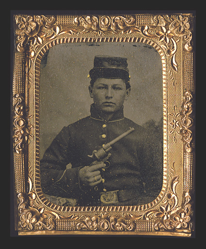 with tinted cheeks and buttons. With a 4.25 x 3.25 TintPhotography: Collection Six images, five of them from the Civil War era. Includes a choice pair of 3"" x 2.5"" Ambrotypes in a dual case, each showing a man in a war-era shell coat with tinted cheeks and buttons. With a 4.25"" x 3.25"" Tintype of the same pair seated together. Also with a 2.5" x 2.1" Tintype of a youth in a shell jacket, kepi, and eagle-buckled belt, holding a pistol! His buttons, belt, and ring have been tinted gold. With another 2.5" x 2.1" Tintype of a young trooper in a jaunty cavalry-style hat, his hat tassel, buttons, and uniform braid tinted gold. Finally, with a cabinet card Photograph of a meeting of the John Anderson post of the Grand Army of the Republic, ca. 1890. Seventeen veterans pose with their post's flag. This post, in Wilder, KS, is in a region once raided by Quantrill's partisans. It is now part of the Kansas City suburbs. A choice group, all at least VG. (imagea) (imageb) (Image) Est. $300-400