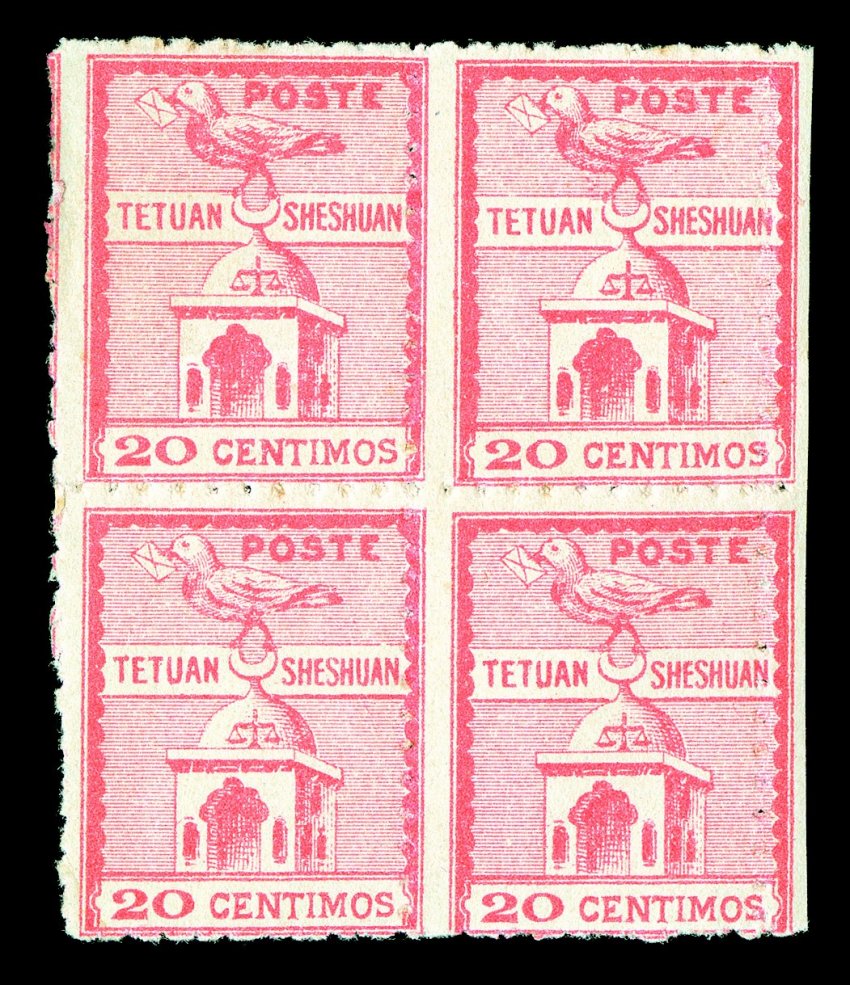 486 og/nhbl Yvert #148, 151 ImageYvert #148, 151, 1897 20c Rose and 75c Blue Tetouan & Chechouan locals, each in a block of four, strong colors, o.g., top stamps h.r., bottom stamps n.h., one 20c stamp with small thin, owner's handstamp on 75c, fine; any value from this series is rarely seen in blocks. (imagea) (Image) €3,200+
