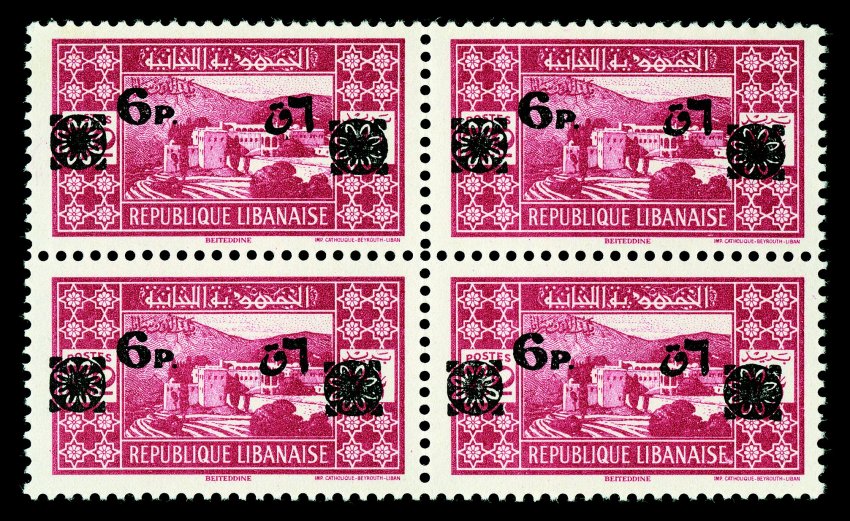 691 nhbl Yvert #85/97 var. ImageYvert #85-87 var., 97 var., 1927 50c, 1pi, 1.50pi and 25pi "Republique Libanaise" overprints, with thin bars at top, each in a corner sheet-margin block of four except 50c is a left margin block, o.g., n.h., very fine. (Image) Est. $400-500