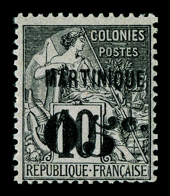 803 og Yvert #9 ImageYvert #9, 1888 "MARTINIQUE/05c." Surcharge on 4c Claret on lavender, choice mint example of this very scarce stamp, fresh and well centered, o.g., very fine; only 368 stamps were issued; signed A. Diena and accompanied by 1984 Friedl certificate (Scott #11; $1,375.00). (Image) €1,700