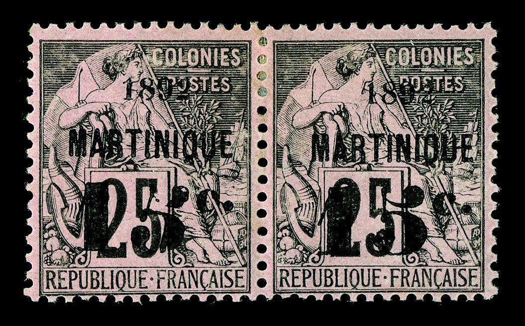 811 og Yvert #30b ImageYvert #30b, 1892 "1882/15c./MARTINIQUE" Date error surcharge on 25c Black on rose, horizontal se-tenant pair, the left stamp the error, o.g., h.r., fine and scarce (Scott #32, 32a; $580.00 for singles). (Image) for singles €737
