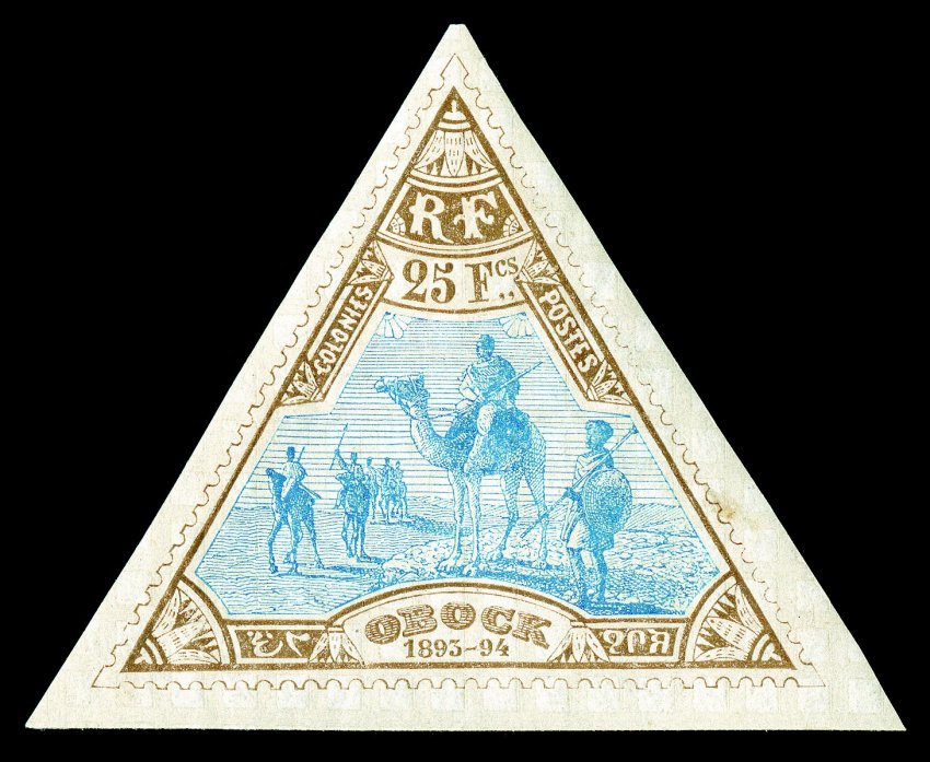 941 og Yvert #12b ImageYvert #12b, 1892 "OBOCK" Straightline overprint on 4c Claret on lavender, omitted overprint, top right corner margin vertical strip of three, the center stamp the error, fresh and intact, o.g., h.r., the error n.h., fine and scarce; signed Marquelet; ex-Gibralter (Scott #12 var.). (Image) €720+