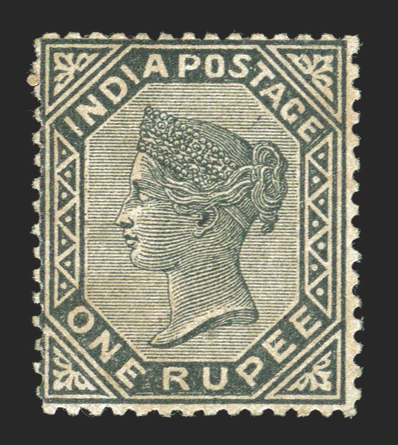 1082 og SG #101 var. ImageS.G. #101 var., 1883 1R Slate, Khundo Sakharam postal forgery type 2, unused without gum as made, small perf. fault at left, otherwise fine. (Image) Est. $100-150