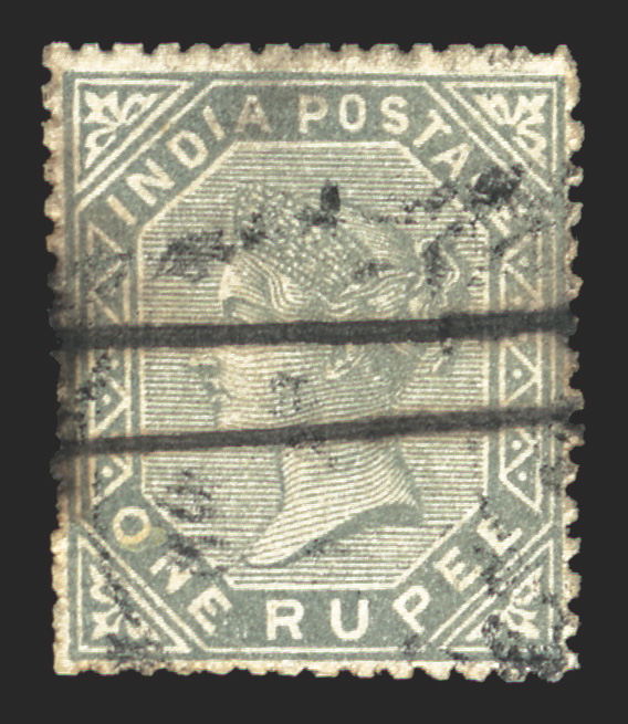 1083 O SG #101 var. ImageS.G. #101 var., 1883 1R Slate, Khundo Sakharam postal forgery type 2, used with town cancel and portion of violet company handstamp, small thinned spot, fine appearance. (Image) Est. $100-150