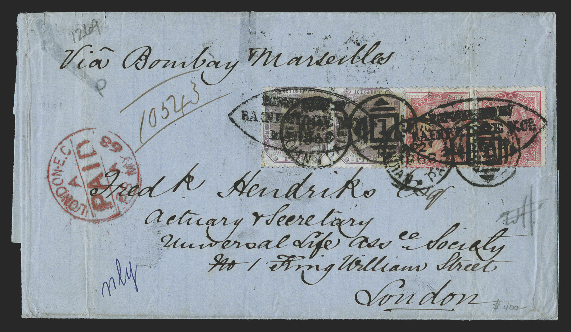 1093 c SG 69 ImageS.G. #69, 1866 4a Green, single tied along with two 8p Purple (S.G. #52, one light stain), by "Kurrachee/18 Ju, 70" duplex postmark to folded letter to Bordeaux, clear blue double oval "Forwarded By/Jemsetjee Rustomjee/Kurrachee" handstamp across the stamps and repeated at bottom left, "Via Marseilles" directive, boxed "P.D" handstamp and red French entry c.d.s., Bombay and Bordeaux backstamps, very fine; this forwarding agent is not recorded by Rowe. (Image) Est. $150-200