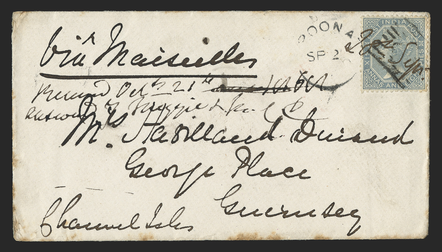 1095 c SG #72 ImageS.G. #72, 1867 6a8p Slate, two covers from the same correspondence from Poona to Guernsey, Channel Islands with "Via Marseilles" directives, first July 1866 franked by 8p Purple, 1a Chocolate horizontal pair and 4a Grey-black (S.G. #52, 60, 46), the other September 1867 franked by 6a8p, which was issued specifically to pay the ½oz rate via Marseilles, very fine duo. (imagea) (Image) Est. $150-200
