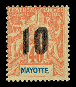 761 c Maury #(5) ImageMaury #(5), French Colonies 1859 40c Orange on yellowish, single with large to huge margins all around, tied by perfectly struck "Mayotte et Dep., Mayotte/10 Sept. 77" datestamp to folded cover to France, postmark repeated at left, "via Brindisi" directive and red transit postmark, cover with bottom portion of address panel missing, very fine and rare usage (Scott French Colonies #5). (Image) €4,250
