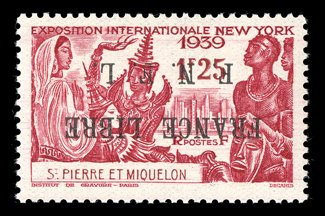 830 nh Yvert #281A-82A ImageYvert #281A-282A, 1942 "FRANCE LIBRE/F.N.F.L." overprint on 1.25Fr. and 2.25Fr New York World's Fair, inverted overprints, both fresh and well centered, o.g., n.h., extremely fine and rare; each signed Calves and Rendon (Scott #256-57 var.). (imagea) (Image) for hinged €4,400