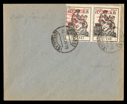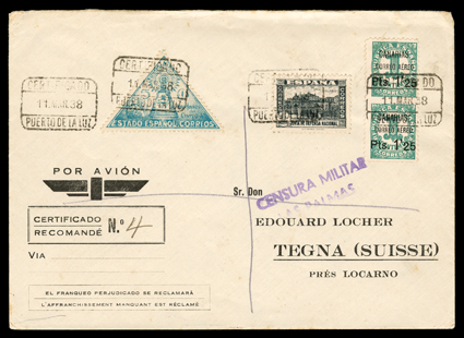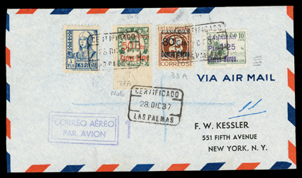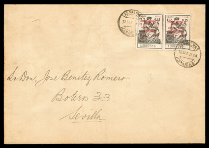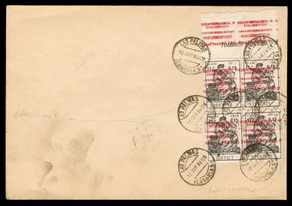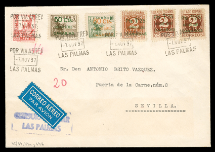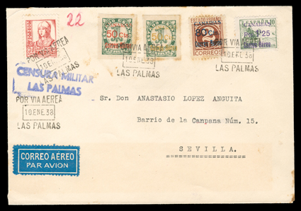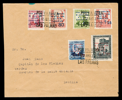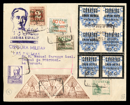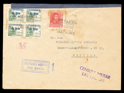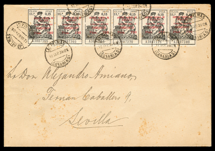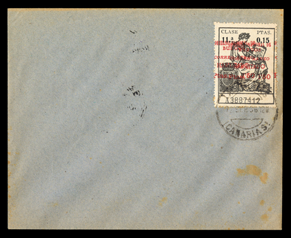 955 c   ImageEdifil Burgos #18A, 1936 "GOBIERNO NATIONAL DE/BURGOS/CORREO AEREO/HABILITADO/Ptas. 1'50" red local patriotic overprint on grey-black fiscal incredible collection of 454 covers, many franked with multiples of stamps and their seven varieties, only one of which are listed in Edifil, #18Ahe showing the composition error with "G" of "GOBIERNO" inverted and without the second "E" in "AEREO", plus #18Ahh the double overprint error, however there are six other major varieties which should be, but are not, listed by Edifil, plus a number of major errors and some with the overprint on the selvage, which are also unlisted (See Dennis Florence's original plating research and quantities of each believed to exist listed below), all covers are cancelled by "Las Palmas, Canarias/12 Sep 36" datestamp, addressed to Seville or unaddressed (unaddressed covers come from the same mail bag as addressed covers) and all bear the 14 September Seville backstamp, noteworthy are the over 30 stamps with double overprints ranging from single frankings to blocks of four, four covers with stamps with double overprint, one inverted, plus eight stamps printed in the selvage on four covers, which were accepted as postage; these covers, even those which are unaddressed, were flown from Las Palmas to Seville likely on LAPE emergency service to the mainland, also includes is Mr. Florence's blown-up photos, platings and other background information; by far and away the largest holding of these covers in existence as only a total of 1,200 stamps are believed to have been issued, and an ideal basis from which to form an exhibit. (imagea) (imageb) (imagec) (imaged) (imagee) (imagef) (imageg) (imageh) (imagei) (imagej) (Image) Est. $7,500-10,000