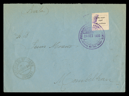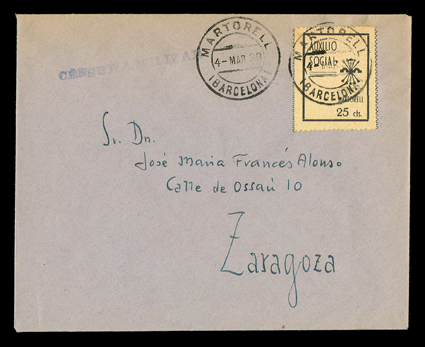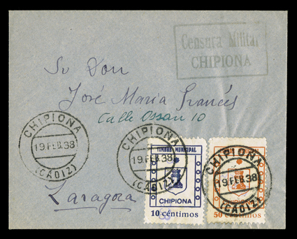960 c   ImagePostal fiscals used on cover collection of 60 items, all are Nationalist usages from Granada and its environs, most with additional obligatory tax local Granada issue and nearly all bear a circular military censor handstamps, wide range of revenue issues, a very fine and attractive lot. (Image) Est. $750-1,000