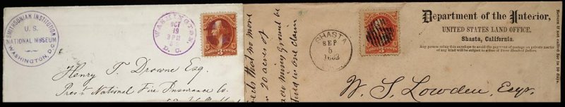 41 c Official interesting postal history lot of seventeen covers, most with departmental imprints, excellent variety, with five 3c or 6c Interior including usages from the Land Office in Shasta, Ca. (with ms. note: "Secretary of Interior directs that no more than 20 acres of mining ground be entered in one claim") and Gainesville, Fla., plus one with violet Smithsonian Institution handstamp at top left, two 3c Navy, four 3c or 6c Post Office, two 3c Treasury including one postmarked Greensboro, N.C. plus a 10c Bank Note (#209) used on Treasury Dept. imprint envelope to the U.S. Consul in Hawaii, and finally three War Dept. usages, some small faults but mostly fine or better; a nice lot for the official specialist. (Image) Est. 500-750