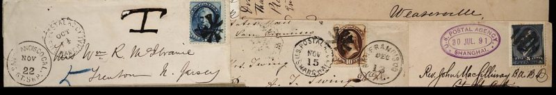 45 c U.S. Post Offices in China 19th century postal history lot of twenty covers, most are Bank Note issues, includes seven franked with a 10c Brown Bank Note with "U.S. Postal Agcy Shanghai" c.d.s. postmark, plus two 5c Blue with the same cancels, five franked with 5c Garfield with "U.S. Postal Agency/Shanghai" in violet oval, one of these additionally franked with five 1c Blue. one with 5c Small Bank Note and two with 5c Bureau issue, also an 1861 10c Green (#68) with Yokohama c.d.s., a large part of cover franked with an amazing block of twenty, strip of three and a pair of the 2c Brown Bank Note with Yokohama c.d.s. tying the large block, plus a stampless cover from the U.S. Consulate General at Shanghai to Ningpo, with blue "Consulate General/Shanghai, China/Mar 20 1894" c.d.s. on reverse, small faults on some, all with fine-very fine appearance; a interesting lot of scarce covers. (Image) Est. 1,500-2,000