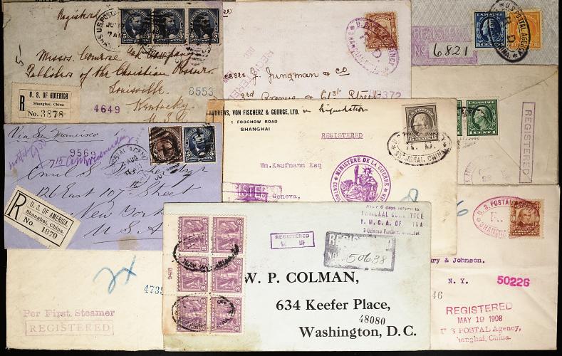 48 c U.S. Postal Offices in China specialized collection of registered covers, 34 items in all (27 covers, 7 fronts), 1900-1922, includes three covers franked with Bureau issues, each with a rare registry label, later issues show a wide range of registry markings, including various straightline, several boxed (many with additional registry markings), "Per First Steamer/Registered", "Received/Registered Mail" in circle, some ms. registered markings, foreign usages include Holland (three), Switzerland and England, and of course many of the receiving cities applied registry backstamps, mainly fine or better; an extraordinary lot for the U.S. Postal Offices in China specialist or a collector of registered mail. (Image) Est. 2,000-3,000