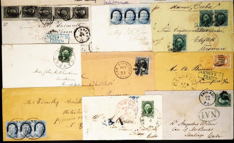 67 c 19th century postal history lot from the Van Bourg estate, several hundred covers from the 1851 Issue through the Bank Notes, with strength in the 1851-1861 issues, includes several usages to foreign destinations, multiple stamps on cover, many 3c 1851's with small town cancels and a couple local or carrier combination usages, several fresh 2c Black Jack covers, fancy numeral cancels on Bank Notes, etc., a number of the covers were purchased individually at auctions or mail sales, many of the covers will retail in the $50.00-$200.00 range, most are fine or better; an excellent lot for the postal history dealer as there is a diverse range of interesting and saleable covers here. (Image) Est. 1,500-2,000