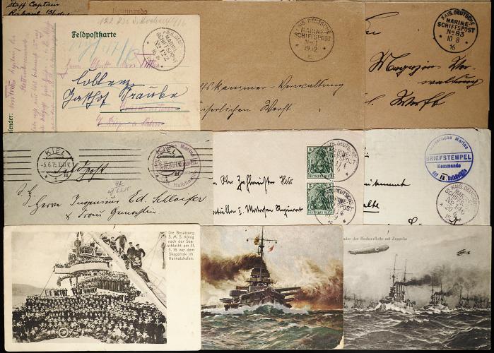 980 c "The Battle of Jutland" Exhibition collection offered intact, consisting of 67 covers and a nearly equal number of related postcards (some of which are actual photographs), chronicling the mail of the German naval squadron that battled the British in May of 1916, the covers are mostly stampless postmarked by "Kais. Deutsche/Marine Schiffspost" with number and date, from 1915-1918 (most are from 1916), all of the covers are annotated as to which ship they were from and in some cases the name and/or rank of the sender, the postcards show pictures of the various ships from the fleet as well as some photographs of the staff; accompanying the lot is an extensive write up (in German) of history of the fleet, some newspaper articles and other collateral material; this unique collection was exhibited in the 1960's where it won several medals; an exciting lot for the World War I postal historian. (Image) Est. 3,000-4,000
