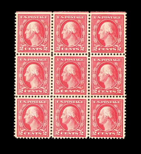 673 ogbl 505 #505, 5c Rose error, single error in a marvelously select block of nine, in addition to the incredible centering that frames a perfectly centered and choice error, the most impressive aspect of this block is its radiant rose color, o.g., error stamp faintly hinged (if at all), rest n.h., a minute inclusion speck of little significance in one 2c stamp, extremely fine. (Image) 675.00