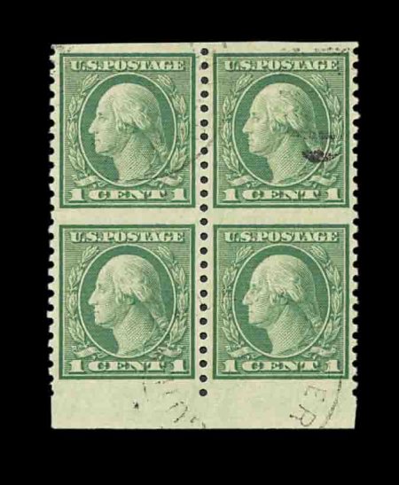 690 Obl 538a #538a, 1c Green, vertical pair, imperforate horizontally, two pairs in bottom margin block of four, beautifully centered, lightly cancelled by duplex town cancels, very scarce used and rarely offered thus. extremely fine. (Image) 250.00